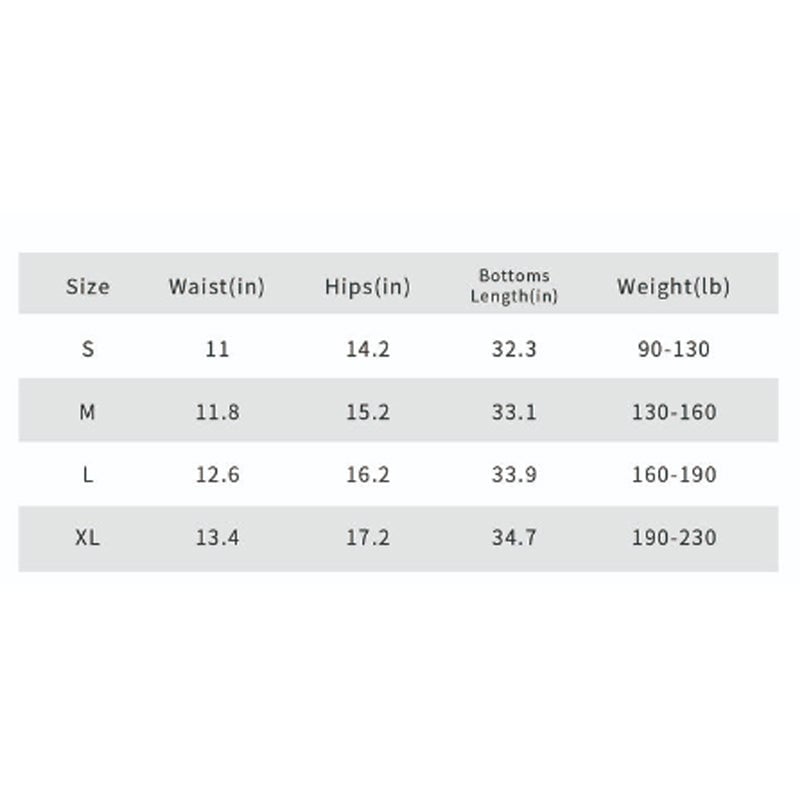 | Size | Waist (cm/in) | Hip (cm/in) | Inseam (cm/in) | Recommended Weight (kg/lbs) |